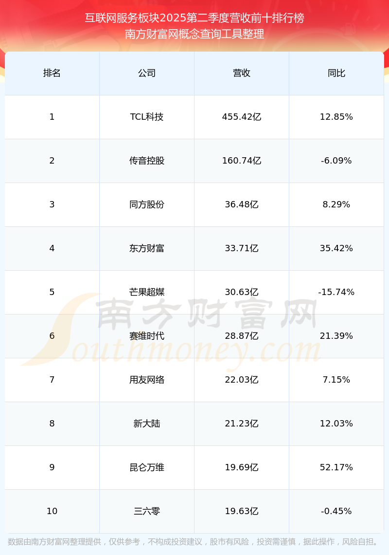 按照南方財(cái)富網(wǎng)概念查詢工具統(tǒng)計(jì),該股所屬板塊為互聯(lián)網(wǎng)服務(wù)板塊,該板塊共有52只股票,新炬網(wǎng)絡(luò)2025第二季度營收在該板塊中排名為第52名,該板塊2025第二季度營收排名前十的股票如下表: