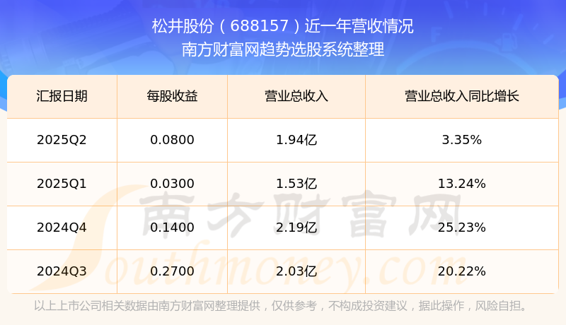 松井股份2025年第二季度顯示,公司主營收入1.94億元,同比3.35%;歸母凈利潤847.44萬元,同比-70.4%;扣非凈利潤737.42萬元,同比-69.83%。