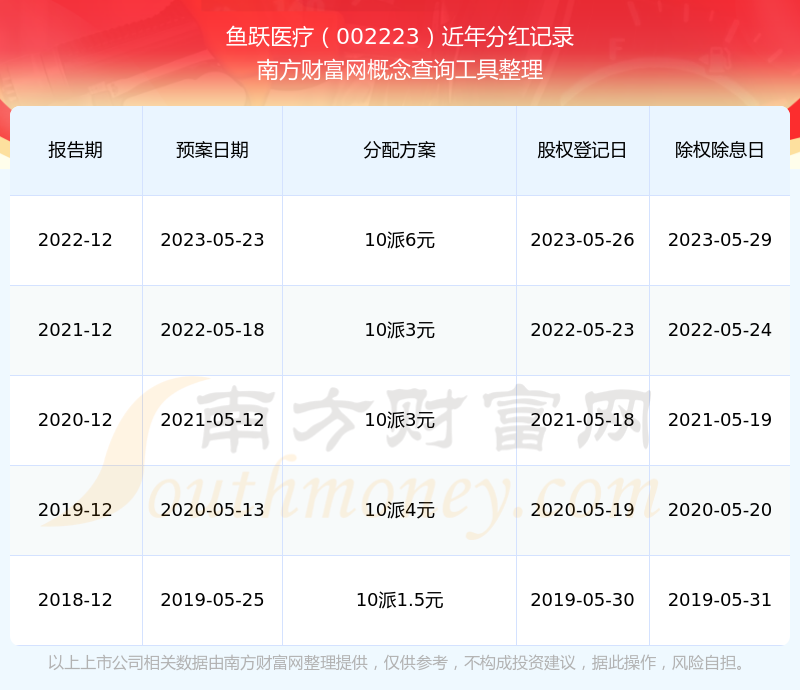 魚躍醫(yī)療最新一次公布的分紅方案為10派6元。本次權(quán)益分派股權(quán)登記日為2023年5月26日,除權(quán)除息日為2023年5月29日,派息日為2023年5月29日。