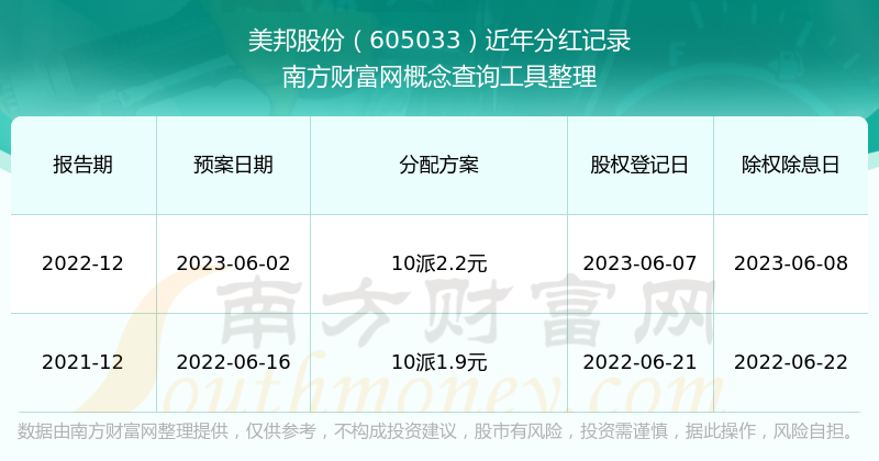 美邦股份最新一次公布的分紅方案為10派2.2元。本次權(quán)益分派股權(quán)登記日為2023年6月7日,除權(quán)除息日為2023年6月8日,派息日為2023年6月8日。