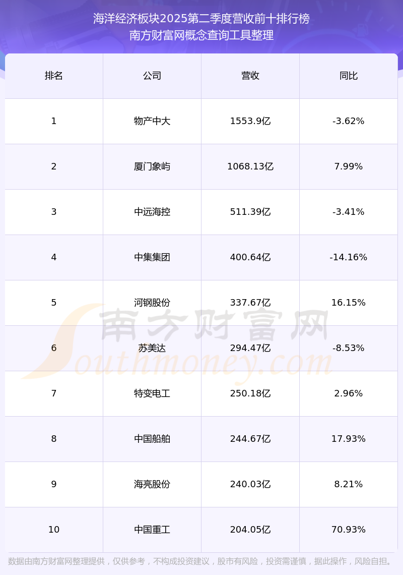按照南方財(cái)富網(wǎng)概念查詢工具統(tǒng)計(jì),該股所屬板塊為海洋經(jīng)濟(jì)板塊,該板塊共有146只股票,寧波海運(yùn)2025第二季度營(yíng)收在該板塊中排名為第71名,該板塊2025第二季度營(yíng)收排名前十的股票如下表: