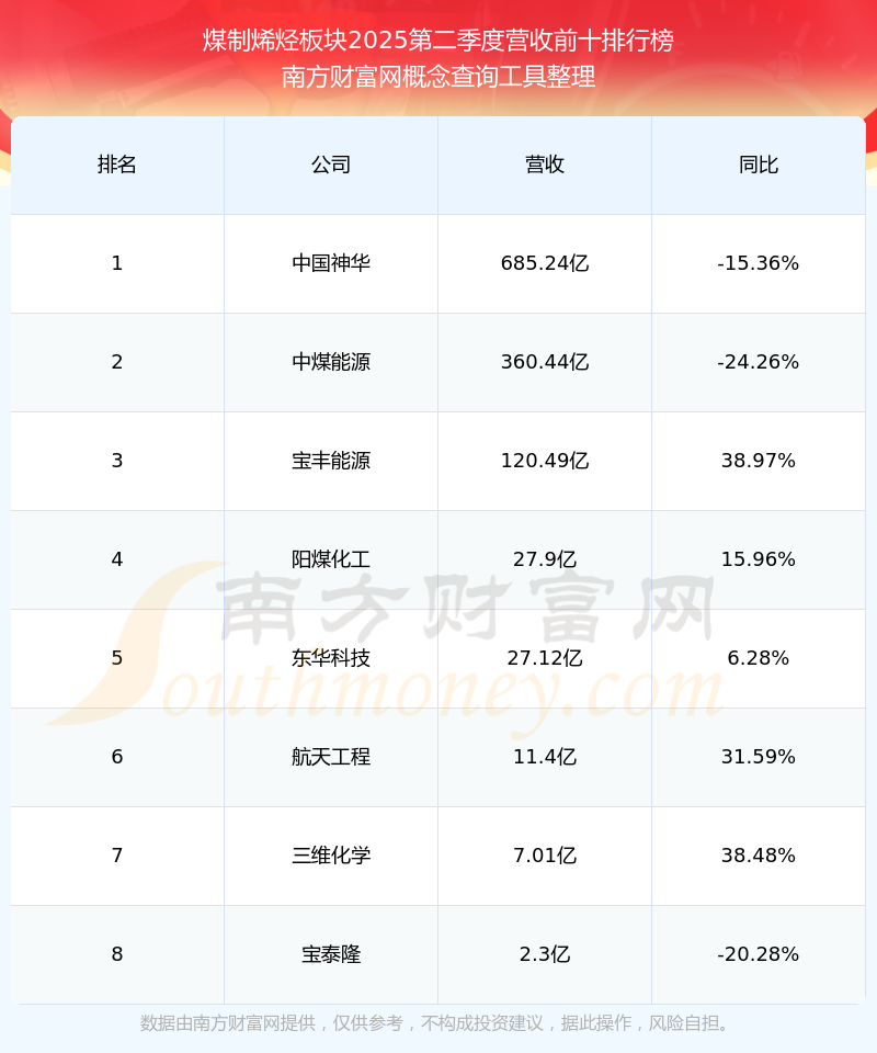 按照南方財富網(wǎng)概念查詢工具統(tǒng)計,該股所屬板塊為煤制烯烴板塊,該板塊共有8只股票,寶豐能源2025第二季度營收在該板塊中排名為第3名,該板塊2025第二季度營收排名前十的股票如下表: