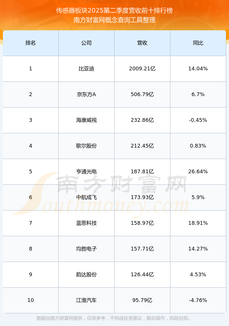 按照南方財富網(wǎng)概念查詢工具統(tǒng)計,該股所屬板塊為傳感器板塊,該板塊共有190只股票,敏芯股份2025第二季度營收在該板塊中排名為第155名,該板塊2025第二季度營收排名前十的股票如下表: