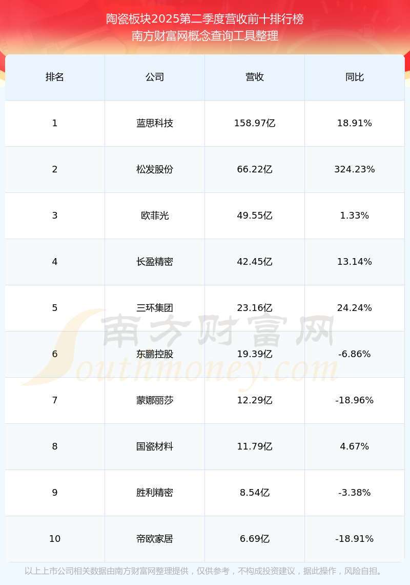 按照南方財(cái)富網(wǎng)概念查詢工具統(tǒng)計(jì),該股所屬板塊為陶瓷板塊,該板塊共有15只股票,四通股份2025第二季度營(yíng)收在該板塊中排名為第15名,該板塊2025第二季度營(yíng)收排名前十的股票如下表: