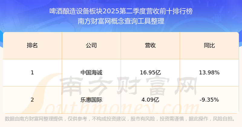 按照南方財(cái)富網(wǎng)概念查詢工具統(tǒng)計(jì),該股所屬板塊為啤酒釀造設(shè)備板塊,該板塊共有2只股票,樂惠國(guó)際2025第二季度營(yíng)收在該板塊中排名為第2名,該板塊2025第二季度營(yíng)收排名前十的股票如下表: