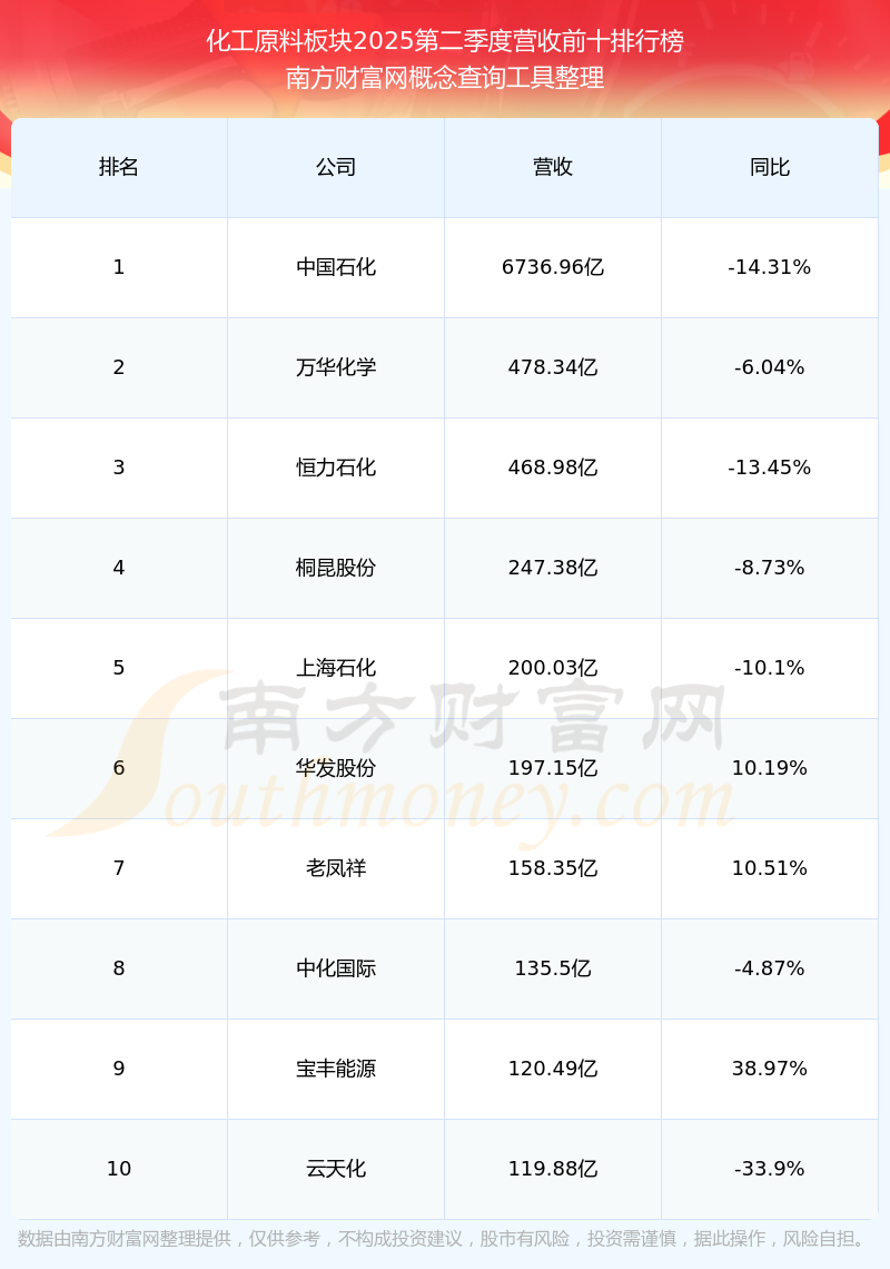 按照南方財(cái)富網(wǎng)概念查詢工具統(tǒng)計(jì),該股所屬板塊為化工原料板塊,該板塊共有124只股票,巨化股份2025第二季度營收在該板塊中排名為第16名,該板塊2025第二季度營收排名前十的股票如下表: