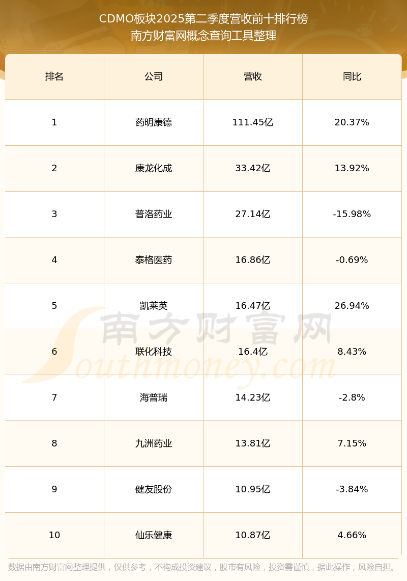 按照南方財富網(wǎng)概念查詢工具統(tǒng)計,該股所屬板塊為CDMO板塊,該板塊共有33只股票,美諾華2025第二季度營收在該板塊中排名為第20名,該板塊2025第二季度營收排名前十的股票如下表: