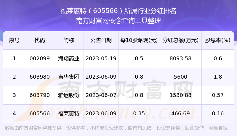 按照南方財富網(wǎng)趨勢選股系統(tǒng)統(tǒng)計,福萊蒽特所屬行業(yè)為染料行業(yè),染料行業(yè)分紅排名情況如下表: