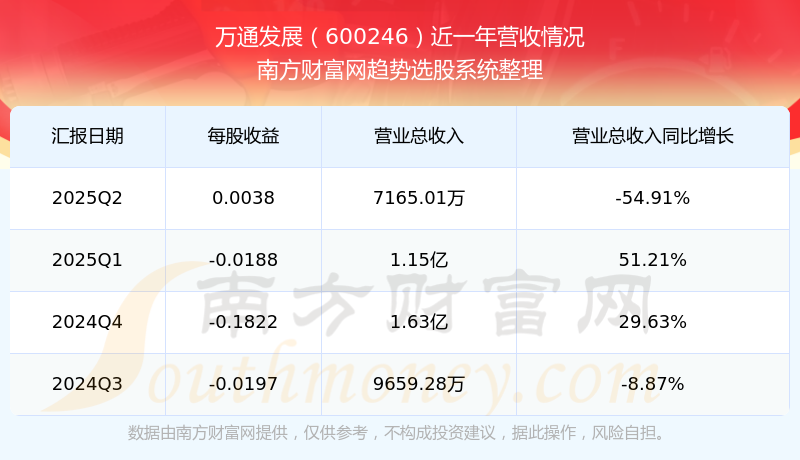 財(cái)報(bào)顯示,2025年第二季度萬通發(fā)展?fàn)I收7165.01萬元,同比增長(zhǎng)-54.91%,凈利潤(rùn)722.32萬元,同比增長(zhǎng)147.23%。
