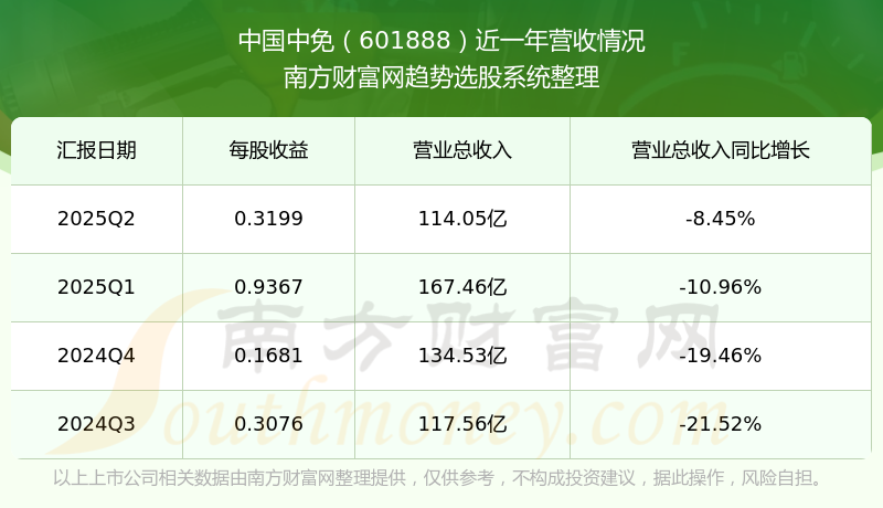 財(cái)報(bào)顯示,2025年第二季度中國(guó)中免營(yíng)收114.05億元,同比增長(zhǎng)-8.45%,凈利潤(rùn)6.62億元,同比增長(zhǎng)-32.21%。
