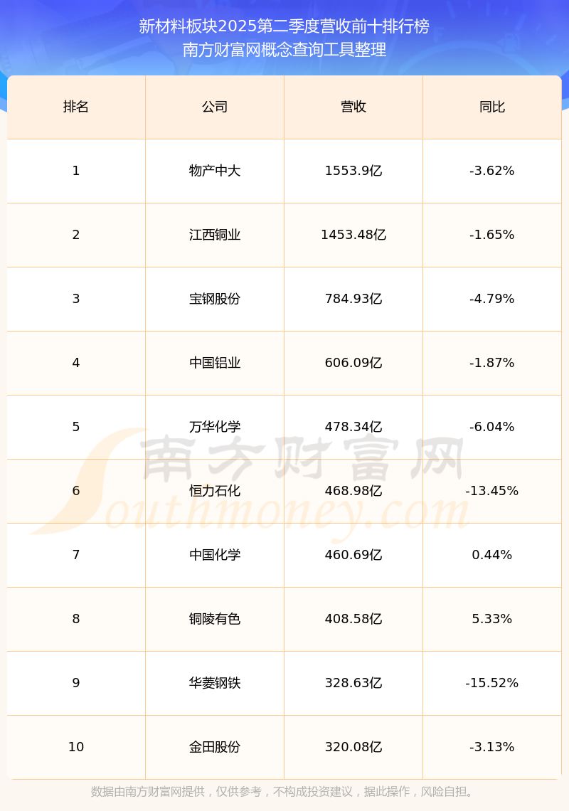 按照南方財富網(wǎng)概念查詢工具統(tǒng)計,該股所屬板塊為新材料板塊,該板塊共有563只股票,佳馳科技2025第二季度營收在該板塊中排名為第454名,該板塊2025第二季度營收排名前十的股票如下表: