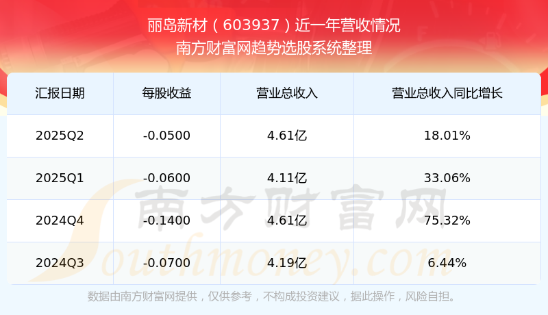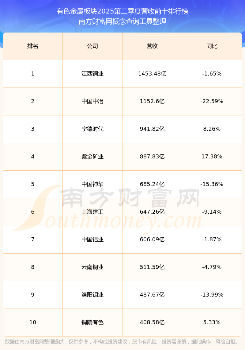 按照南方財富網(wǎng)概念查詢工具統(tǒng)計,該股所屬板塊為有色金屬板塊,該板塊共有289只股票,麗島新材2025第二季度營收在該板塊中排名為第224名,該板塊2025第二季度營收排名前十的股票如下表: