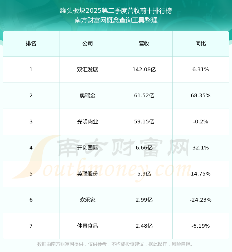 按照南方財(cái)富網(wǎng)概念查詢工具統(tǒng)計(jì),該股所屬板塊為罐頭板塊,該板塊共有7只股票,開創(chuàng)國際2025第二季度營收在該板塊中排名為第4名,該板塊2025第二季度營收排名前十的股票如下表: