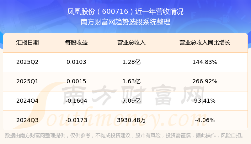 鳳凰股份2025年第二季度公司實現(xiàn)營業(yè)收入1.28億元,同比144.83%;歸母凈利潤964.94萬元,同比398.36%。