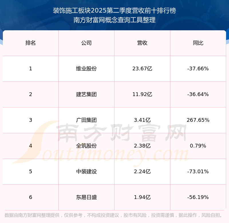 按照南方財(cái)富網(wǎng)概念查詢工具統(tǒng)計(jì),該股所屬板塊為裝飾施工板塊,該板塊共有6只股票,三棵樹(shù)2025第二季度營(yíng)收在該板塊中排名為第6名,該板塊2025第二季度營(yíng)收排名前十的股票如下表: