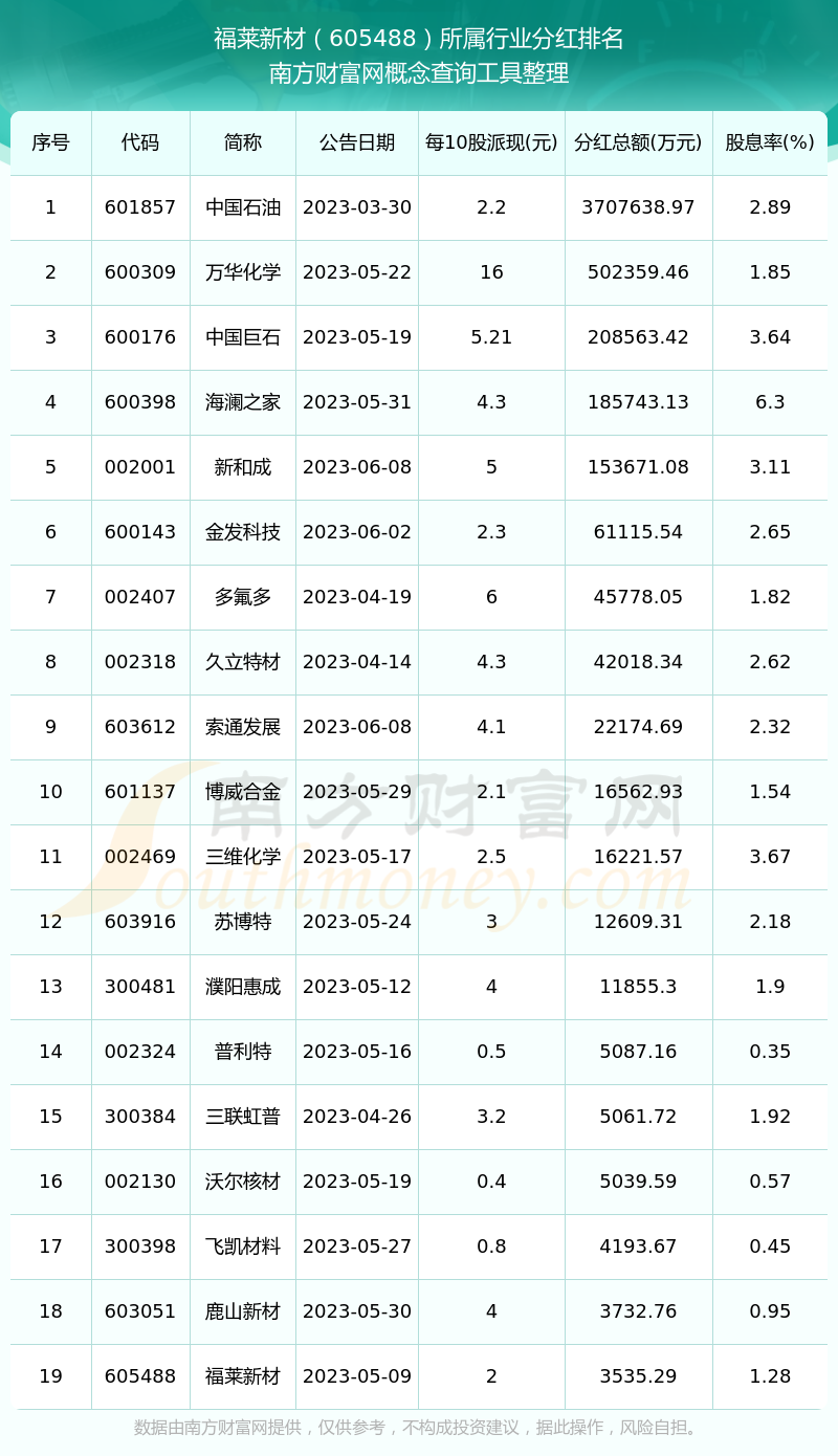 按照南方財(cái)富網(wǎng)趨勢(shì)選股系統(tǒng)統(tǒng)計(jì),福萊新材所屬行業(yè)為新材料行業(yè),新材料行業(yè)分紅排名情況如下表: