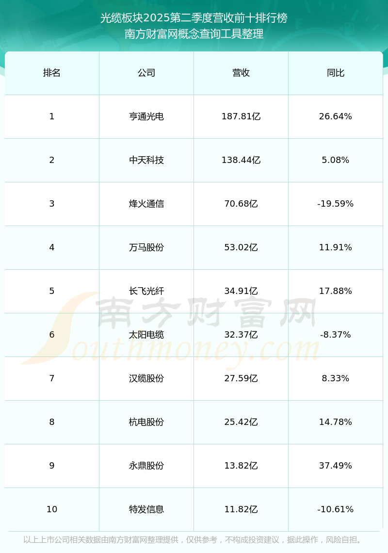 按照南方財(cái)富網(wǎng)概念查詢工具統(tǒng)計(jì),該股所屬板塊為光纜板塊,該板塊共有21只股票,仕佳光子2025第二季度營(yíng)收在該板塊中排名為第14名,該板塊2025第二季度營(yíng)收排名前十的股票如下表: