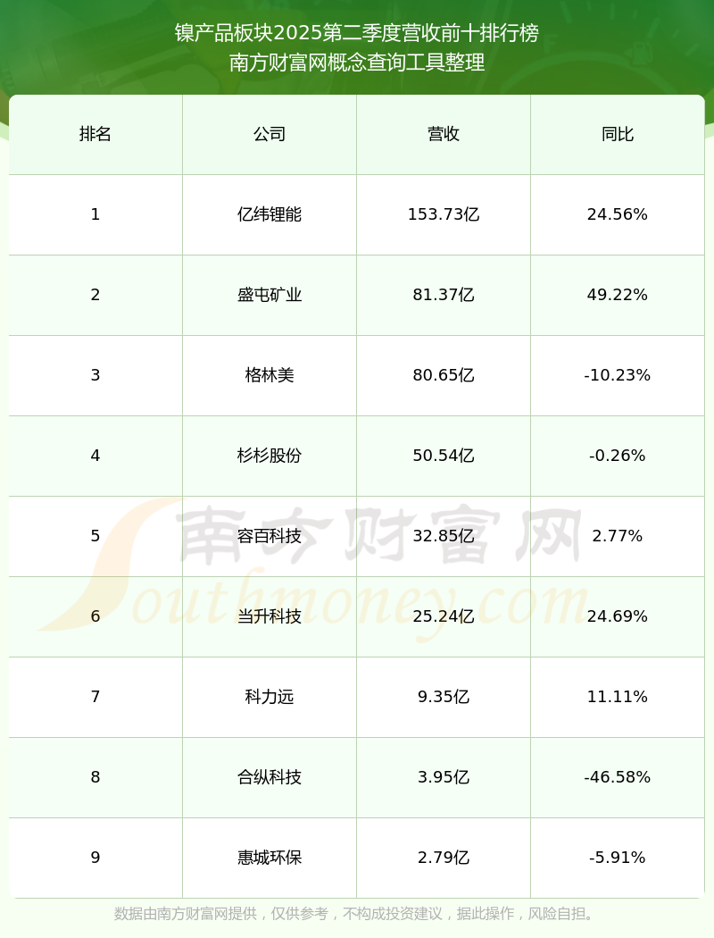 按照南方財(cái)富網(wǎng)概念查詢工具統(tǒng)計(jì),該股所屬板塊為鎳產(chǎn)品板塊,該板塊共有9只股票,科力遠(yuǎn)2025第二季度營收在該板塊中排名為第7名,該板塊2025第二季度營收排名前十的股票如下表: