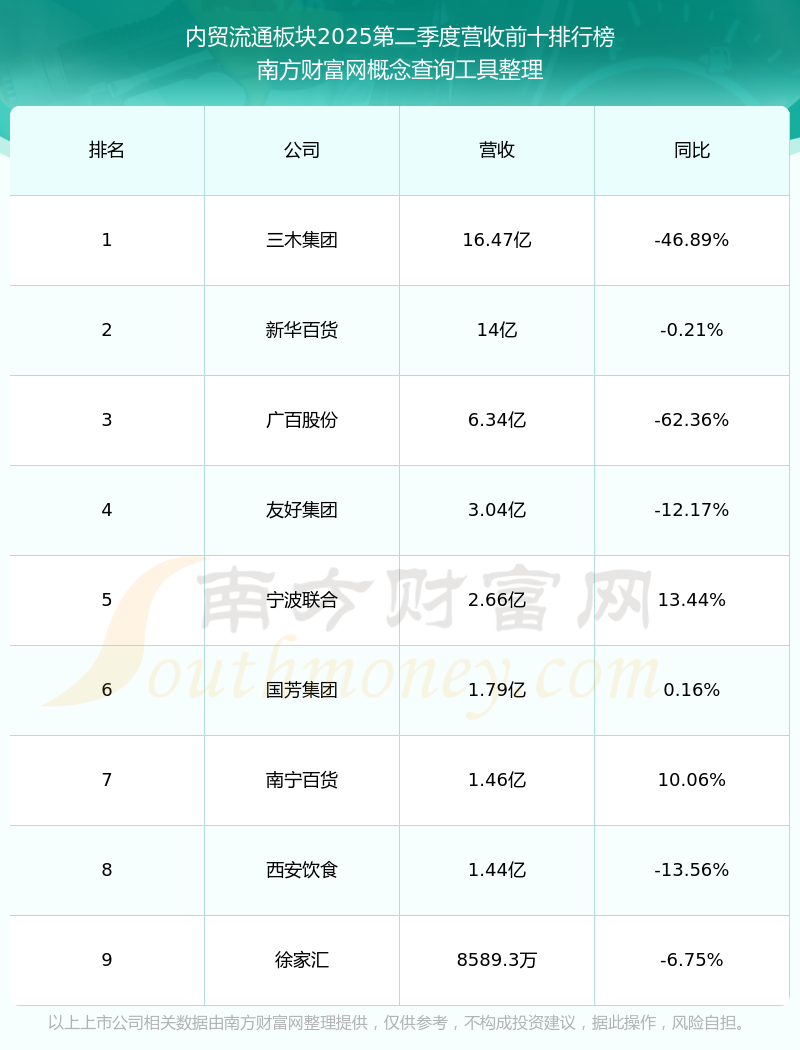 按照南方財(cái)富網(wǎng)概念查詢工具統(tǒng)計(jì),該股所屬板塊為內(nèi)貿(mào)流通板塊,該板塊共有9只股票,南京商旅2025第二季度營(yíng)收在該板塊中排名為第9名,該板塊2025第二季度營(yíng)收排名前十的股票如下表:
