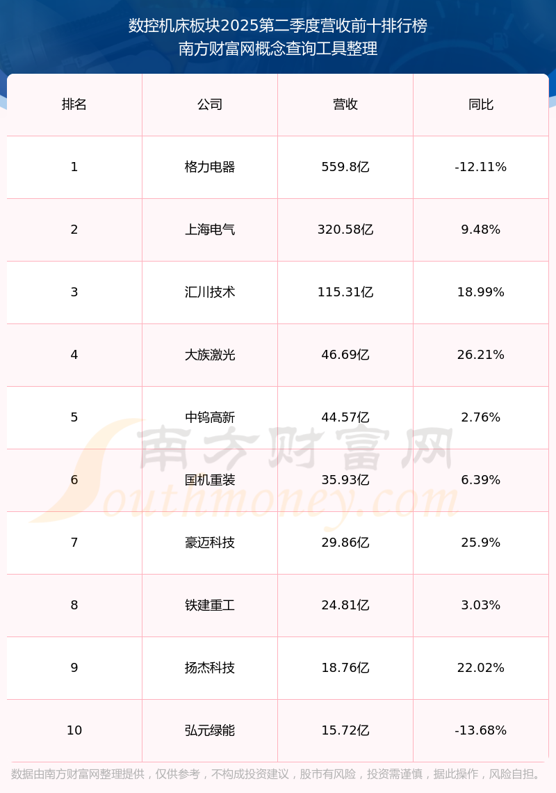 按照南方財富網(wǎng)概念查詢工具統(tǒng)計,該股所屬板塊為數(shù)控機(jī)床板塊,該板塊共有79只股票,國盛智科2025第二季度營收在該板塊中排名為第45名,該板塊2025第二季度營收排名前十的股票如下表: