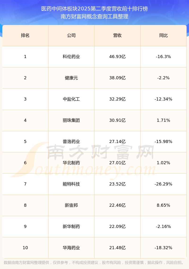按照南方財富網(wǎng)概念查詢工具統(tǒng)計,該股所屬板塊為醫(yī)藥中間體板塊,該板塊共有72只股票,澤璟制藥2025第二季度營收在該板塊中排名為第72名,該板塊2025第二季度營收排名前十的股票如下表: