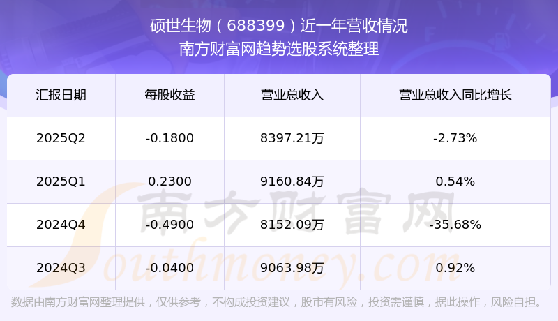 在2025年第二季度,碩世生物的業(yè)績表現(xiàn),主營業(yè)務(wù)收入達(dá)到8397.21萬元,實(shí)現(xiàn)了-2.73%的同比增長率。同時,公司歸母凈利潤錄得-882.68萬元,同比增長18.48%。
