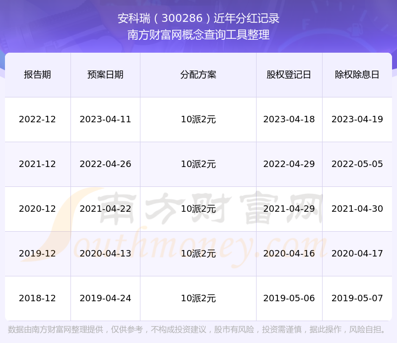 安科瑞最新一次公布的分紅方案為10派2元。本次權(quán)益分派股權(quán)登記日為2023年4月18日,除權(quán)除息日為2023年4月19日,派息日為2023年4月19日。