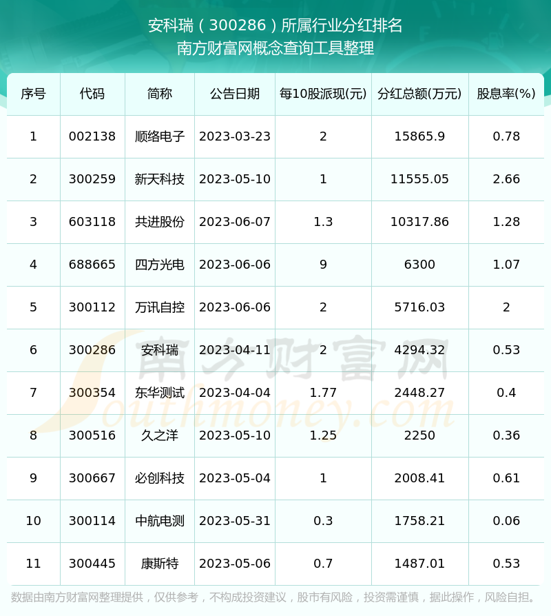 按照南方財(cái)富網(wǎng)趨勢選股系統(tǒng)統(tǒng)計(jì),安科瑞所屬行業(yè)為傳感器行業(yè),傳感器行業(yè)分紅排名情況如下表: