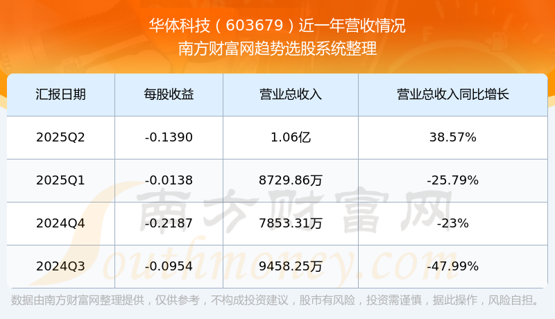 華體科技2025年第二季度財(cái)報(bào)顯示,公司主營收入1.06億元,同比38.57%;歸母凈利潤-2283.75萬元,同比-20.86%;扣非凈利潤-2377.22萬元,同比-48.51%;