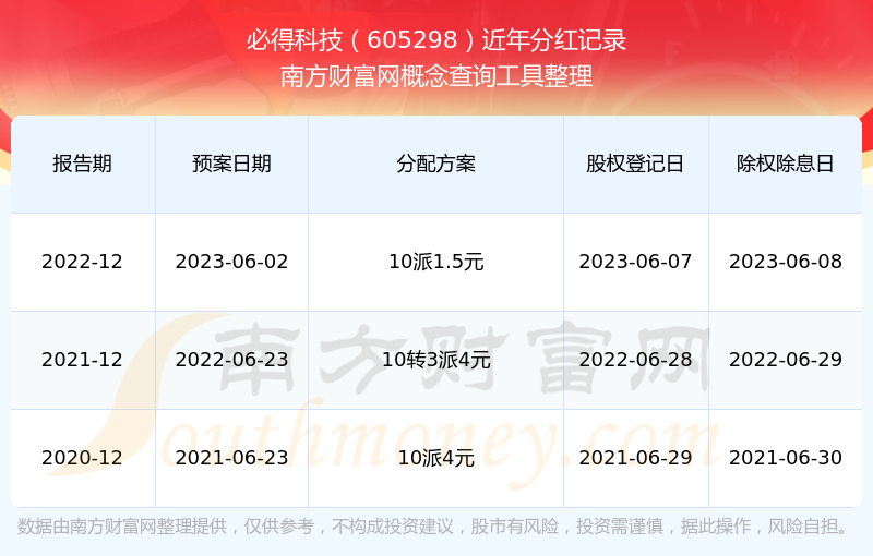 必得科技最新一次公布的分紅方案為10派1.5元。本次權(quán)益分派股權(quán)登記日為2023年6月7日,除權(quán)除息日為2023年6月8日,派息日為2023年6月8日。