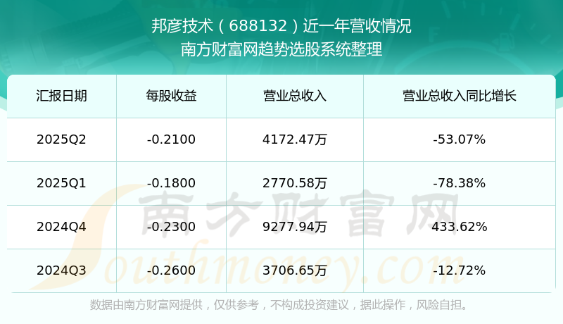財(cái)報(bào)顯示,2025年第二季度邦彥技術(shù)營(yíng)收4172.47萬(wàn)元,同比增長(zhǎng)-53.07%,凈利潤(rùn)-3246.83萬(wàn)元,同比增長(zhǎng)-1149.95%。