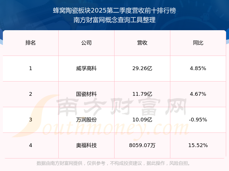 按照南方財富網(wǎng)概念查詢工具統(tǒng)計,該股所屬板塊為蜂窩陶瓷板塊,該板塊共有4只股票,奧福科技2025第二季度營收在該板塊中排名為第4名,該板塊2025第二季度營收排名前十的股票如下表: