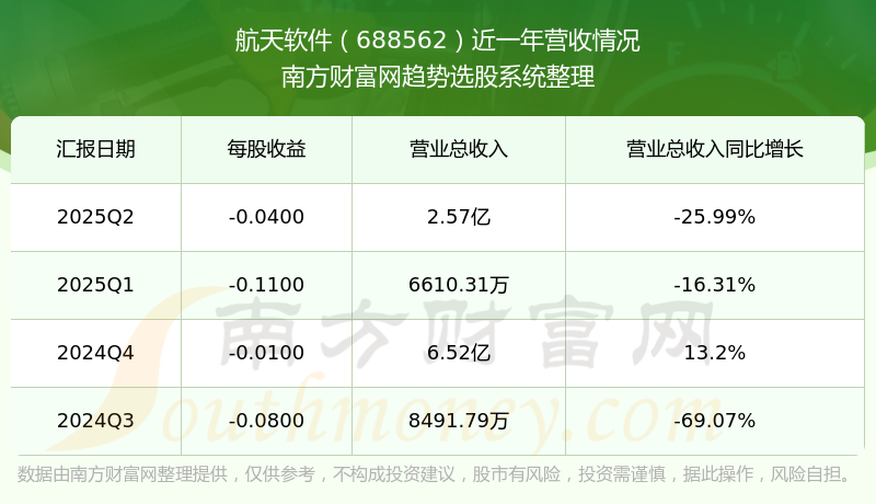 航天軟件2025年第二季度顯示,公司主營收入2.57億元,同比-25.99%;歸母凈利潤-1726.06萬元,同比41.52%;扣非凈利潤-4003.45萬元,同比-23.09%;