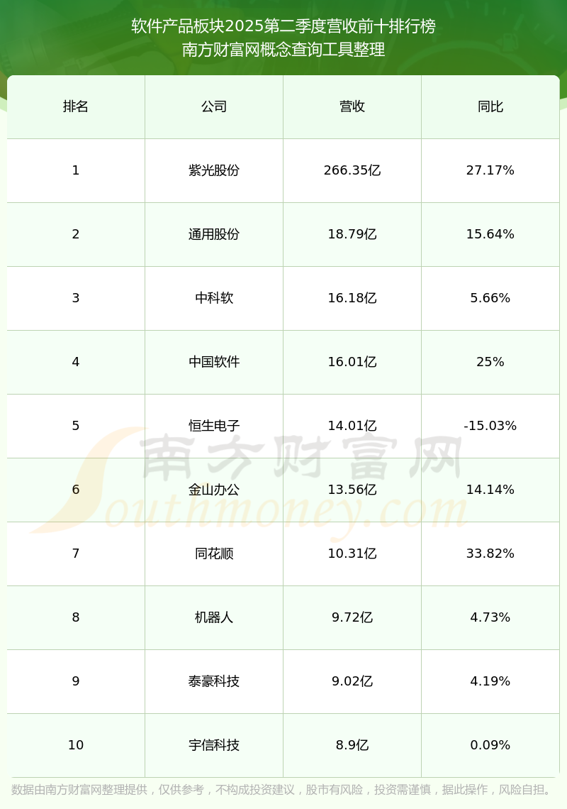 按照南方財富網(wǎng)概念查詢工具統(tǒng)計,該股所屬板塊為軟件產(chǎn)品板塊,該板塊共有28只股票,航天軟件2025第二季度營收在該板塊中排名為第28名,該板塊2025第二季度營收排名前十的股票如下表: