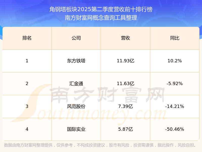 按照南方財(cái)富網(wǎng)概念查詢工具統(tǒng)計(jì),該股所屬板塊為角鋼塔板塊,該板塊共有4只股票,宏盛華源2025第二季度營(yíng)收在該板塊中排名為第4名,該板塊2025第二季度營(yíng)收排名前十的股票如下表: