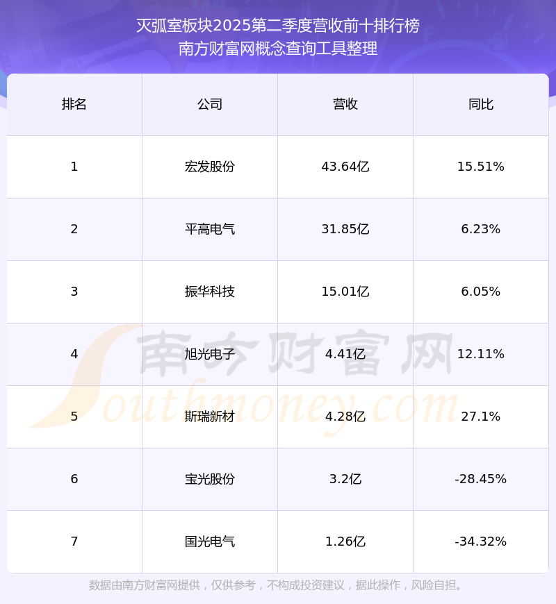 按照南方財富網(wǎng)概念查詢工具統(tǒng)計,該股所屬板塊為滅弧室板塊,該板塊共有7只股票,寶光股份2025第二季度營收在該板塊中排名為第6名,該板塊2025第二季度營收排名前十的股票如下表: