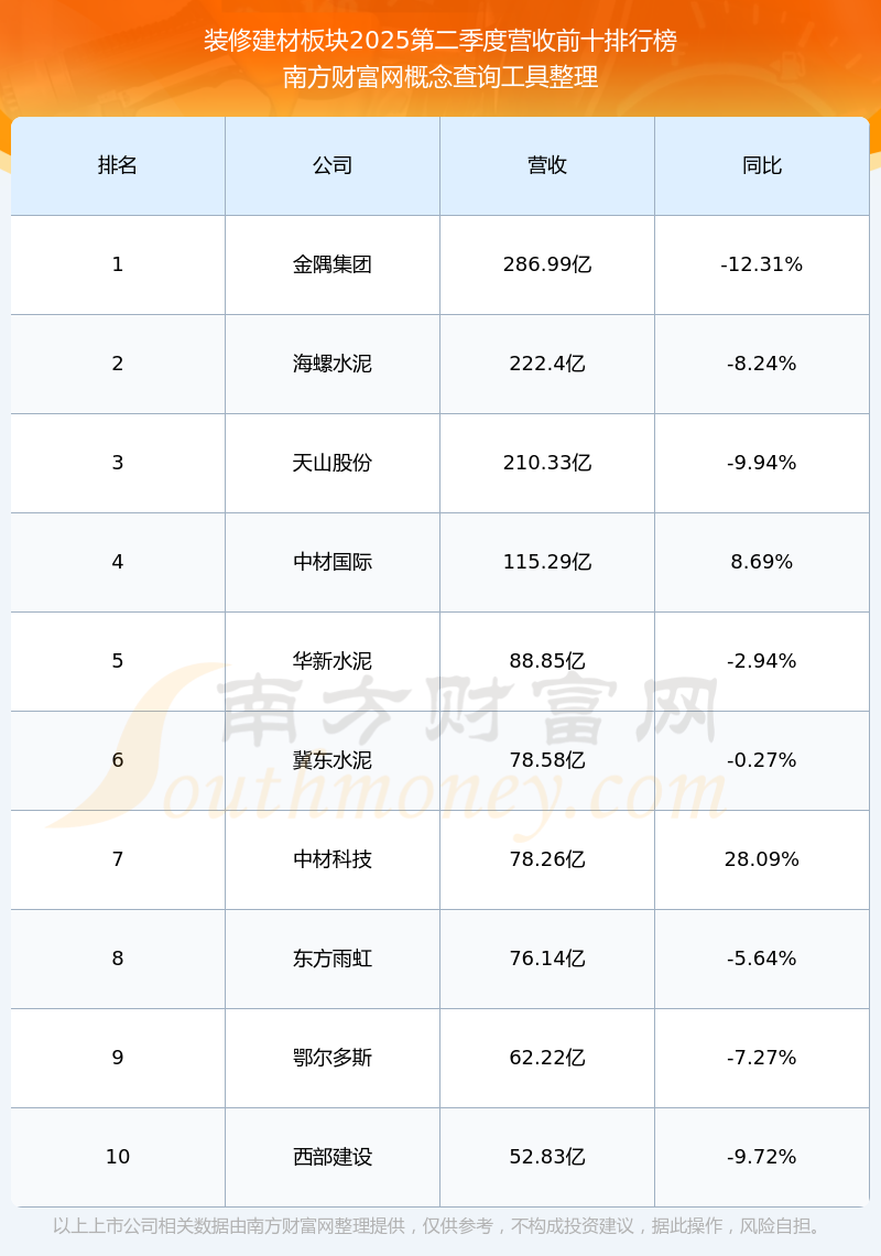 按照南方財富網(wǎng)概念查詢工具統(tǒng)計,該股所屬板塊為裝修建材板塊,該板塊共有82只股票,江山歐派2025第二季度營收在該板塊中排名為第56名,該板塊2025第二季度營收排名前十的股票如下表: