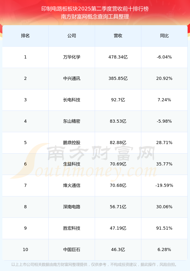 按照南方財(cái)富網(wǎng)概念查詢工具統(tǒng)計(jì),該股所屬板塊為印制電路板板塊,該板塊共有60只股票,景旺電子2025第二季度營收在該板塊中排名為第13名,該板塊2025第二季度營收排名前十的股票如下表:
