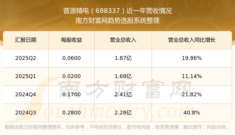 普源精電2025年第二季度財(cái)報(bào)顯示,公司主營(yíng)收入1.87億元,同比19.86%;歸母凈利潤(rùn)1243.31萬(wàn)元,同比829.1%;扣非凈利潤(rùn)-149.19萬(wàn)元,同比87.09%。