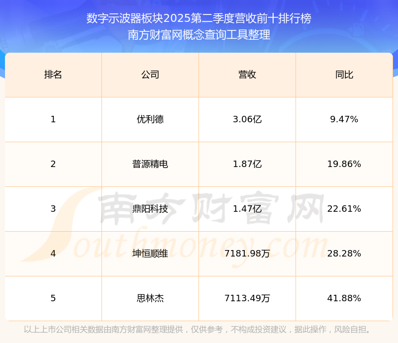 按照南方財(cái)富網(wǎng)概念查詢工具統(tǒng)計(jì),該股所屬板塊為數(shù)字示波器板塊,該板塊共有5只股票,普源精電2025第二季度營(yíng)收在該板塊中排名為第2名,該板塊2025第二季度營(yíng)收排名前十的股票如下表: