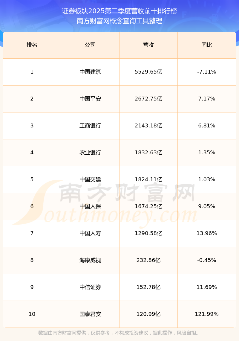 按照南方財富網(wǎng)概念查詢工具統(tǒng)計,該股所屬板塊為證券板塊,該板塊共有65只股票,光大證券2025第二季度營收在該板塊中排名為第25名,該板塊2025第二季度營收排名前十的股票如下表: