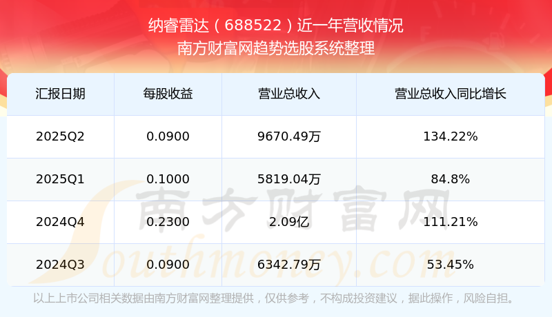 納睿雷達2025年第二季度財報顯示,公司主營收入9670.49萬元,同比134.22%;歸母凈利潤3528.1萬元,同比2027.66%;扣非凈利潤3394.66萬元,同比445.72%;
