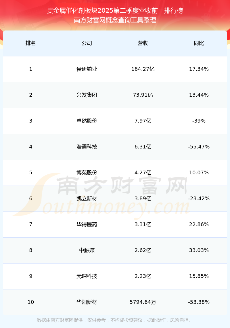 按照南方財富網(wǎng)概念查詢工具統(tǒng)計,該股所屬板塊為貴金屬催化劑板塊,該板塊共有10只股票,凱立新材2025第二季度營收在該板塊中排名為第6名,該板塊2025第二季度營收排名前十的股票如下表: