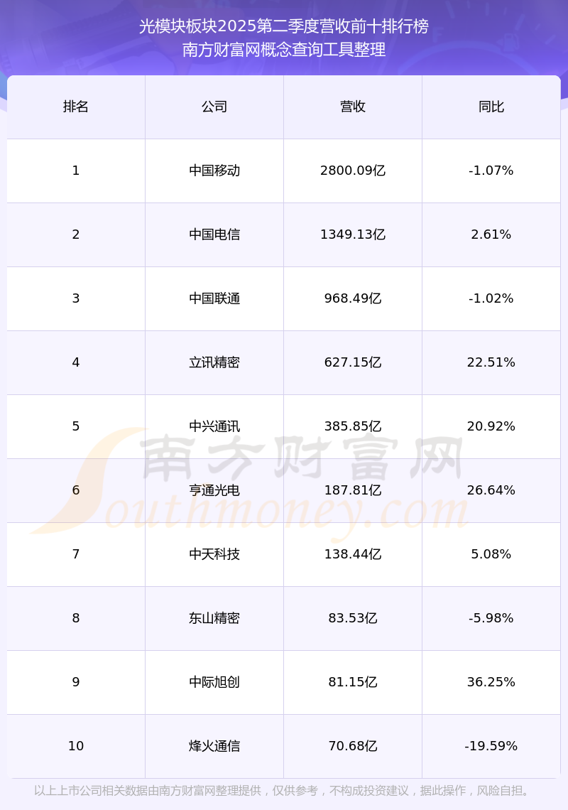 按照南方財富網(wǎng)概念查詢工具統(tǒng)計,該股所屬板塊為光模塊板塊,該板塊共有106只股票,德科立2025第二季度營收在該板塊中排名為第77名,該板塊2025第二季度營收排名前十的股票如下表: