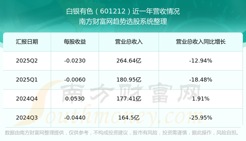于2025年第二季度,白銀有色披露了其業(yè)績(jī)表現(xiàn),其中主營(yíng)業(yè)務(wù)收入264.64億元,相較于去年同期-12.94%。此外,公司歸屬于母公司的凈利潤(rùn)為-1.73億元,同比增長(zhǎng)了-278.74%。在扣除所有非經(jīng)常性損益后,凈利潤(rùn)5663.27萬(wàn)元,同比增長(zhǎng)-50.6%。