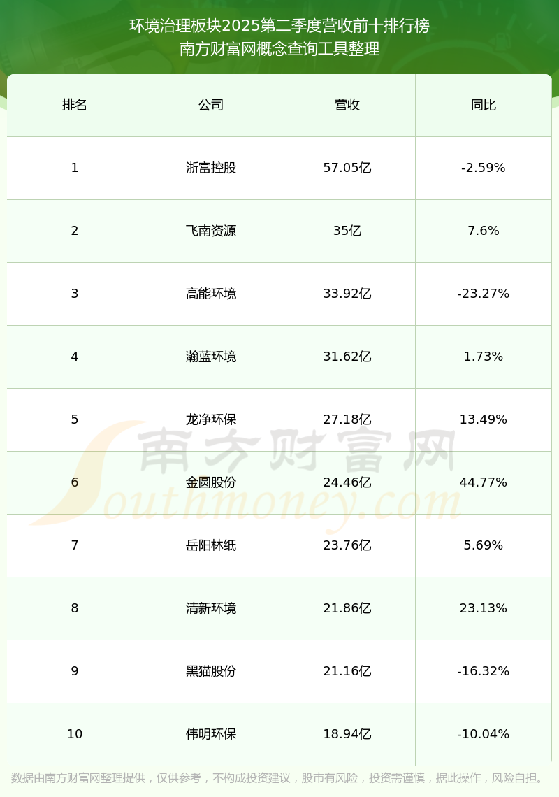按照南方財富網概念查詢工具統(tǒng)計,該股所屬板塊為環(huán)境治理板塊,該板塊共有123只股票,誠邦股份2025第二季度營收在該板塊中排名為第91名,該板塊2025第二季度營收排名前十的股票如下表:
