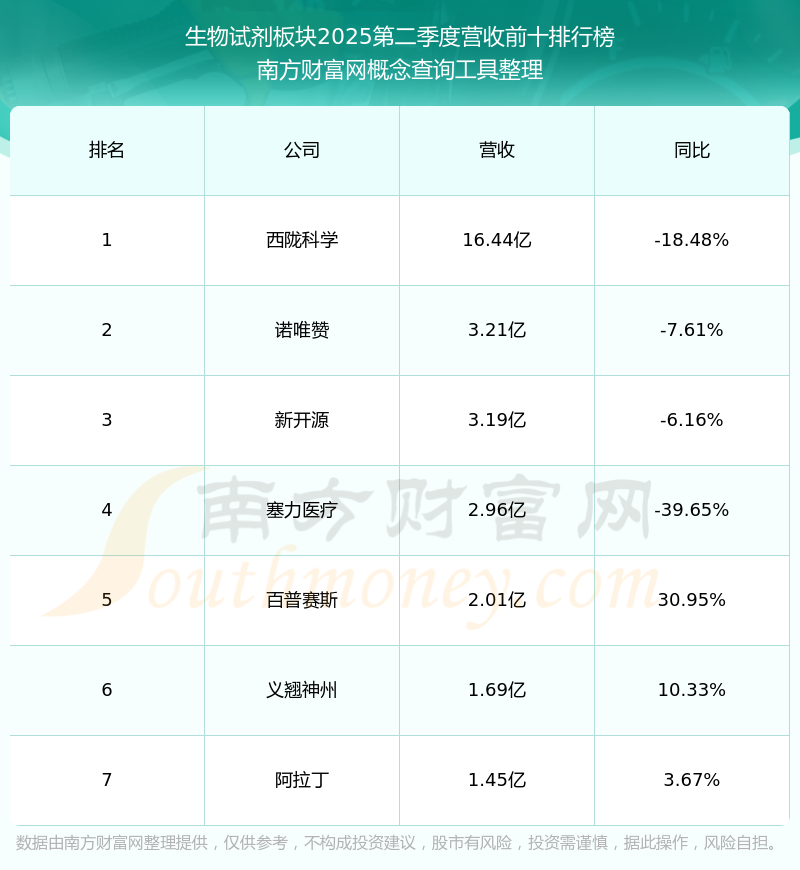 按照南方財富網(wǎng)概念查詢工具統(tǒng)計,該股所屬板塊為生物試劑板塊,該板塊共有7只股票,康為世紀(jì)2025第二季度營收在該板塊中排名為第7名,該板塊2025第二季度營收排名前十的股票如下表:
