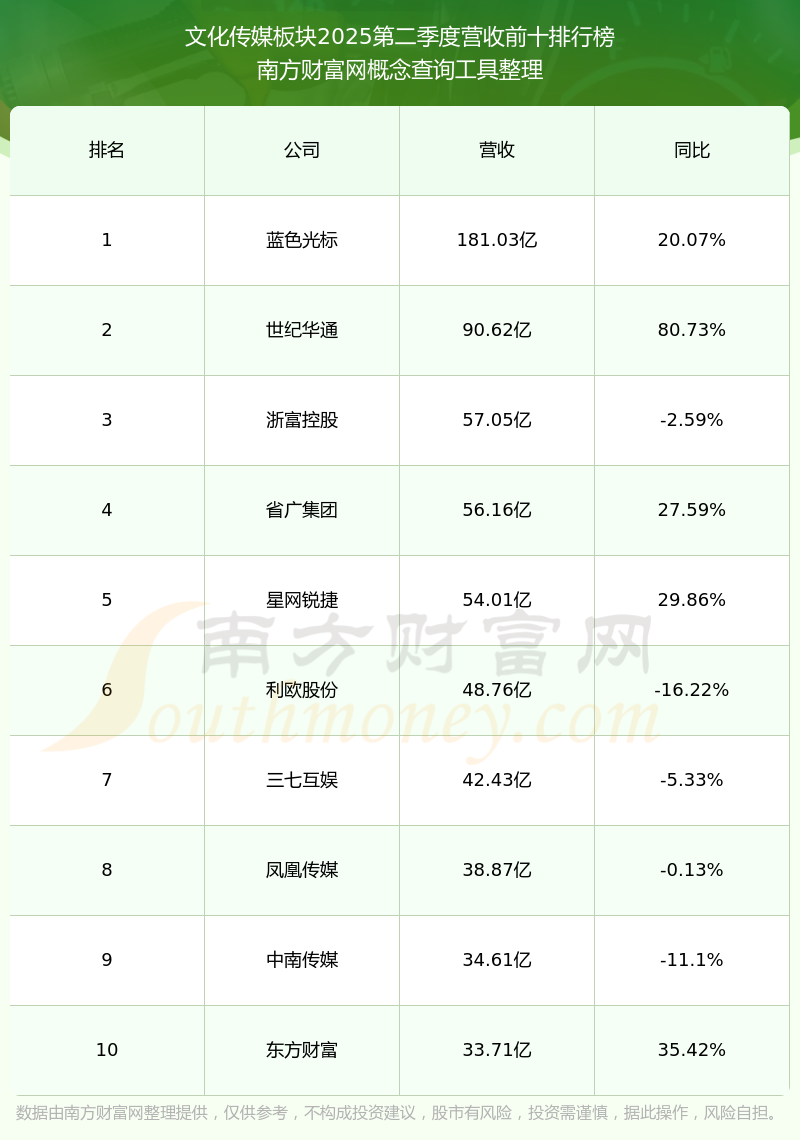 按照南方財富網(wǎng)概念查詢工具統(tǒng)計,該股所屬板塊為文化傳媒板塊,該板塊共有240只股票,浙版?zhèn)髅?025第二季度營收在該板塊中排名為第18名,該板塊2025第二季度營收排名前十的股票如下表: