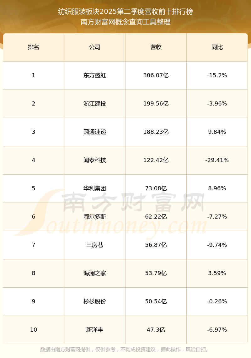 按照南方財(cái)富網(wǎng)概念查詢工具統(tǒng)計(jì),該股所屬板塊為紡織服裝板塊,該板塊共有155只股票,天創(chuàng)時(shí)尚2025第二季度營收在該板塊中排名為第105名,該板塊2025第二季度營收排名前十的股票如下表: