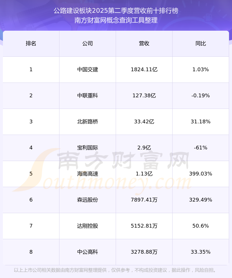 按照南方財(cái)富網(wǎng)概念查詢工具統(tǒng)計(jì),該股所屬板塊為公路建設(shè)板塊,該板塊共有8只股票,交建股份2025第二季度營收在該板塊中排名為第8名,該板塊2025第二季度營收排名前十的股票如下表: